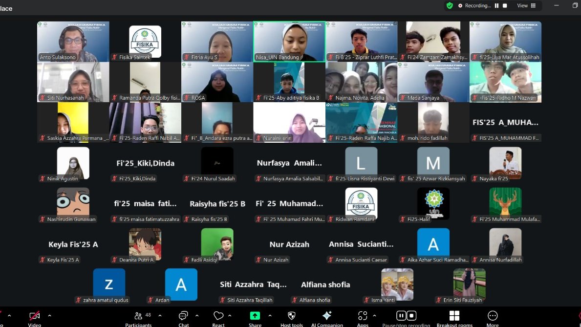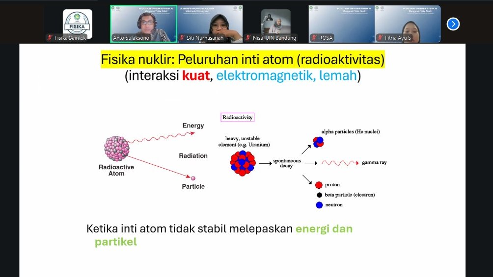 Prodi Fisika Fakultas Sains dan Teknologi (FST) UIN Sunan Gunung Djati Bandung kembali menyelenggarakan kegiatan Kuliah Umum Fisika dengan tema “Mengenal Fisika Nuklir: Dari Dasar Teori Hingga Topik Riset yang Bisa Dikembangkan” pada Selasa, 14 Oktober 2025 secara daring melalui platform Zoom Meeting.