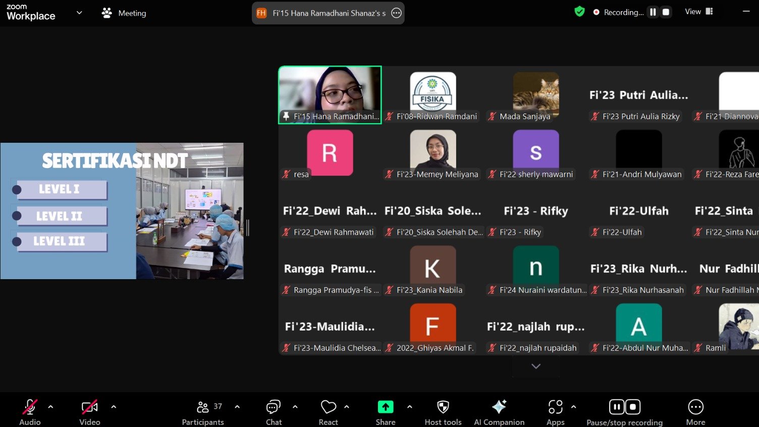 Acara yang berlangsung secara daring melalui Zoom Meeting ini menghadirkan Hana Ramadhani Shanaz, S.Si, Operator Pelaksana NDT di PT Intergy Global Forma, sebagai narasumber. Kegiatan dilaksanakan pada Sabtu, 14 Juni 2025, pukul 10.00–12.00 WIB, dan diikuti oleh mahasiswa Fisika UIN Bandung dari berbagai angkatan.