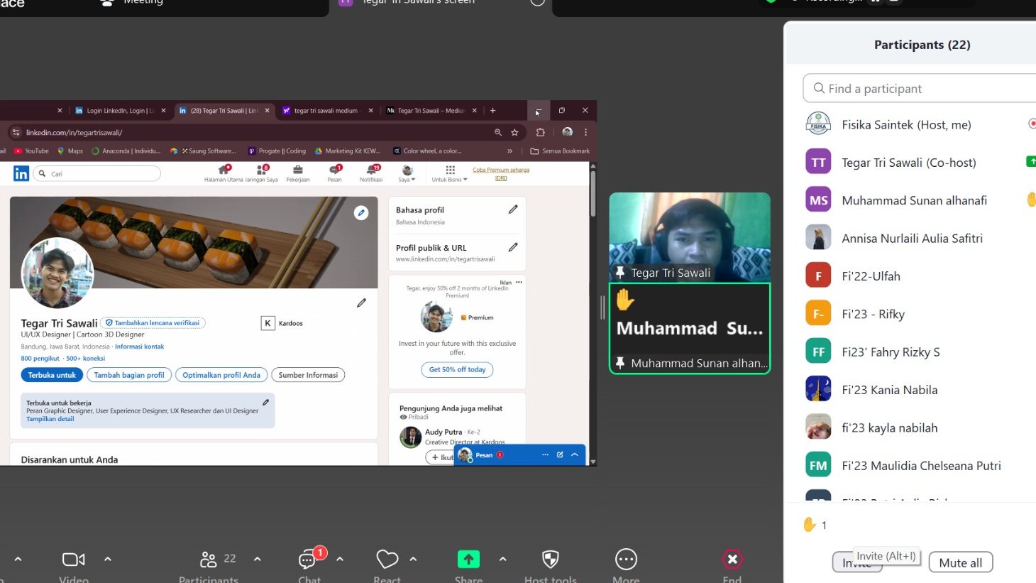 Dalam pemaparannya, Tegar Tri Sawali, S.Si. membagikan pengalaman mengenai bagaimana latar belakang keilmuan Fisika sangat relevan dalam dunia kerja, khususnya dalam pengembangan produk digital. Ia menekankan bahwa kemampuan analisis data, pemecahan masalah secara sistematis, serta berpikir kritis yang terbentuk selama kuliah menjadi modal penting dalam pekerjaannya sebagai Product Manager. Tegar juga membagikan cara membuat portofolio laman Linkedin untuk mencari informasi pekerjaan dan Tegar juga menunjukkan aplikasi kardoos.id tempat dia bekerja.