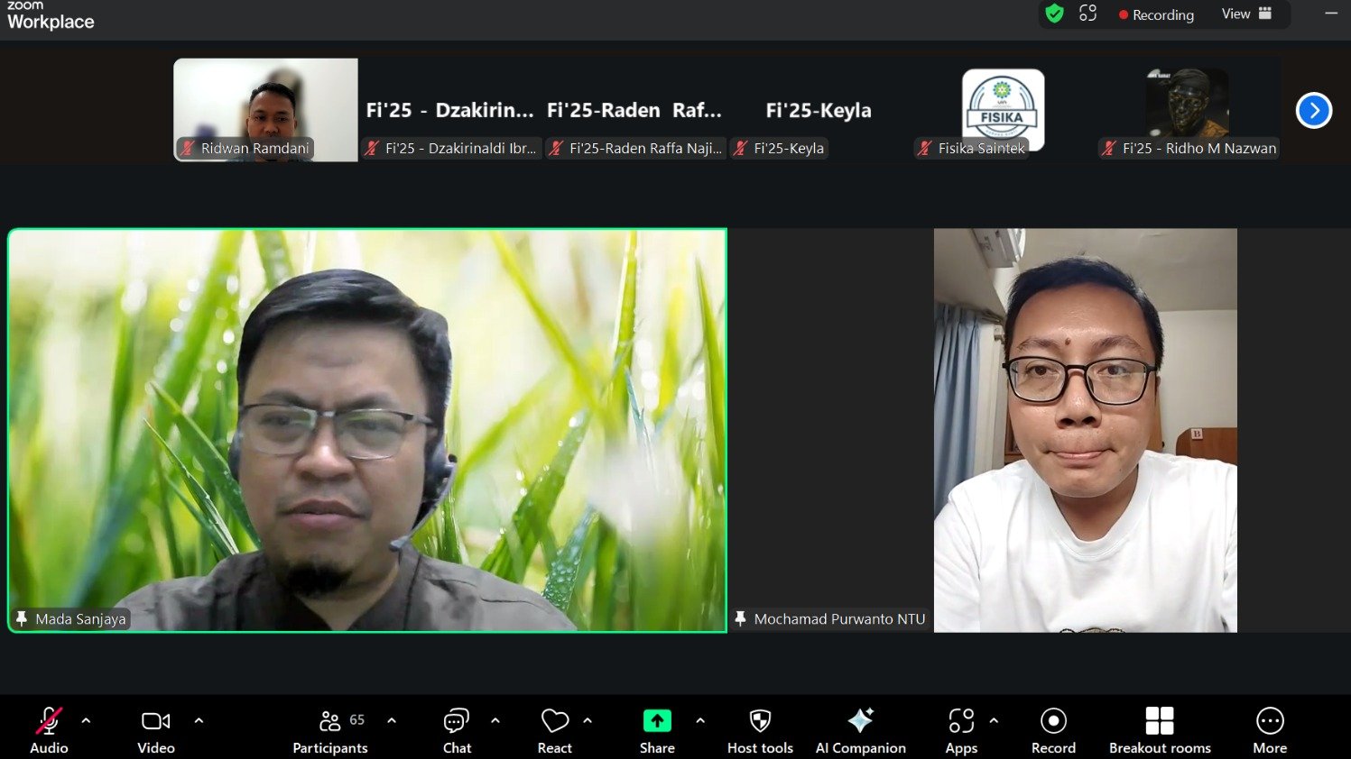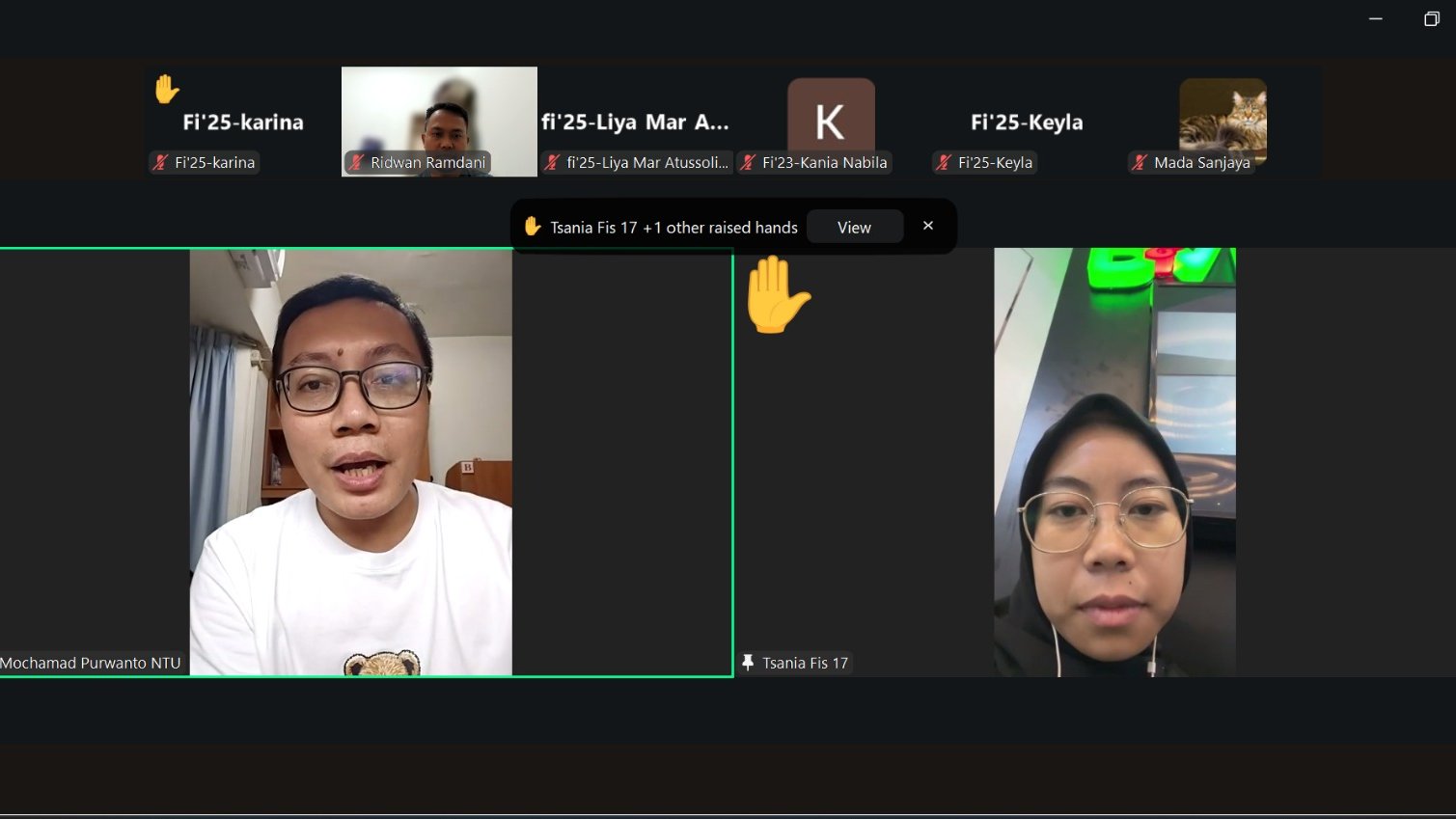 Program Studi Fisika mengadakan kegiatan sharing session jilid 9 bersama alumni, Mochamad Purwanto, S.Si., M.Sc., yang saat ini sedang menempuh studi di National Taiwan University (NTU). Acara ini dilaksanakan pada 30 Agustus 2025 secara online menggunakan Zoom Meeting dan diikuti oleh mahasiswa Fisika dan Alumni.